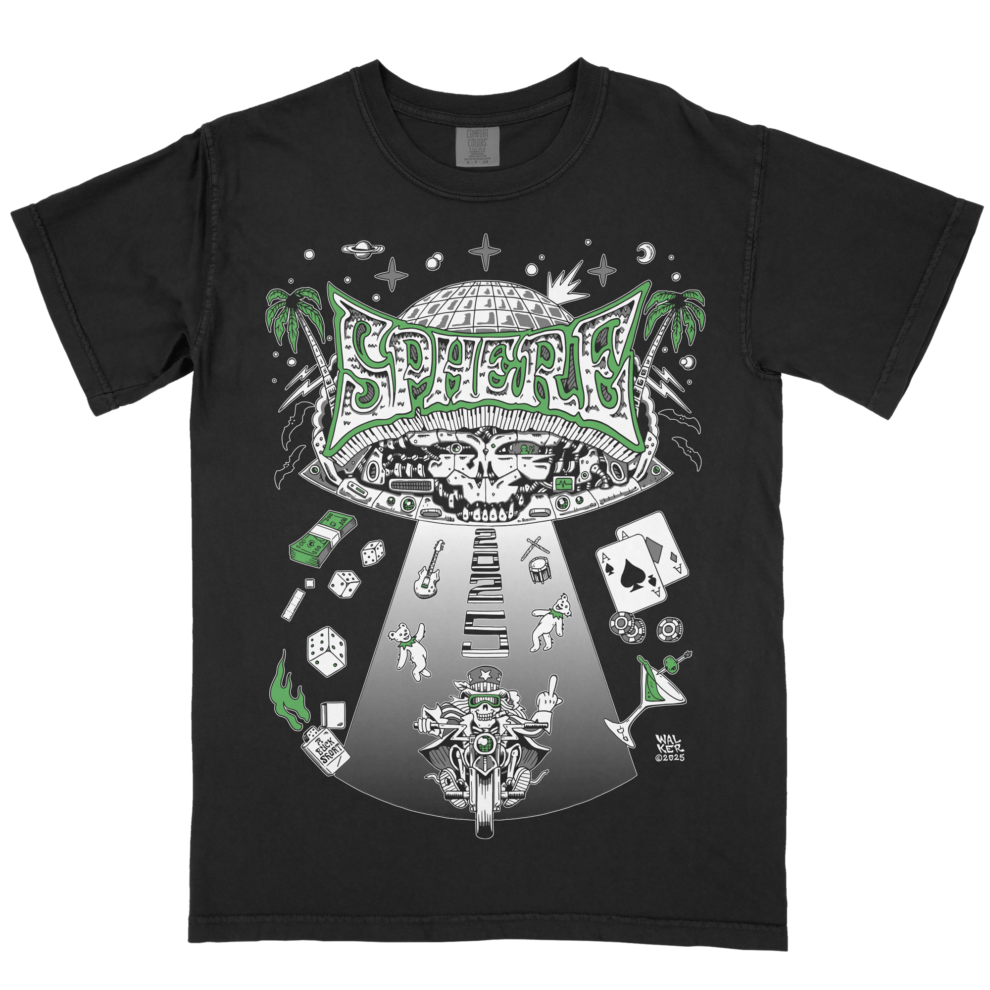 Printed with water based inks on black Comfort Colors. Artwork by Logan Walker.